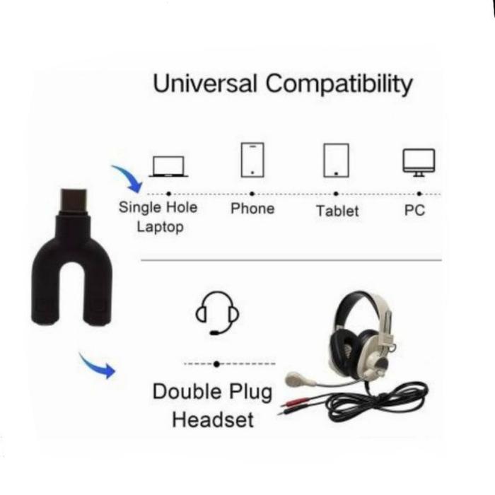 U Shape Splitter Jack TYPE C Male ke Dual Female Headphone dan Microphone. Dengan ini Anda dapat menghubungkan headset yang memiliki Microphone ke laptop / PC / gadget Anda.